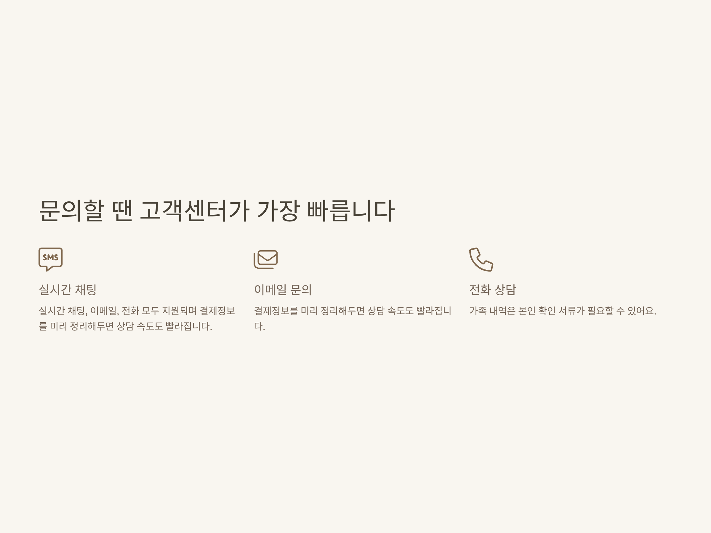 | 실시간 채팅상담 | 신속·편리, 24시간 일부 제공 | 결제정보 미리 준비 |